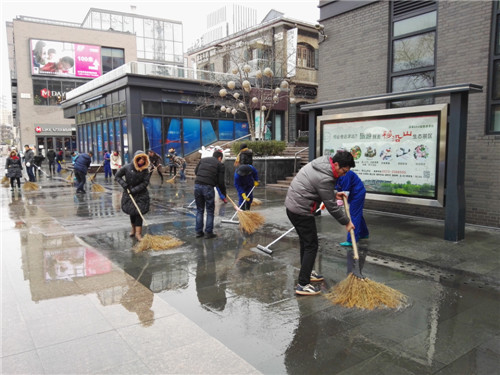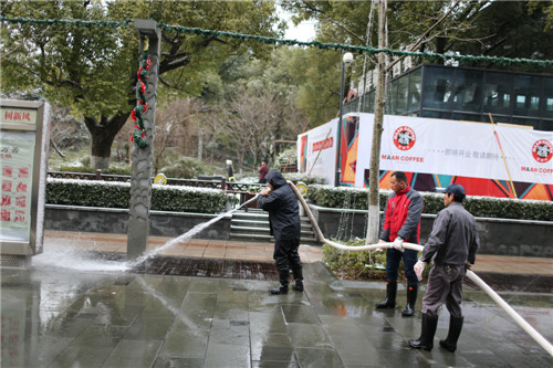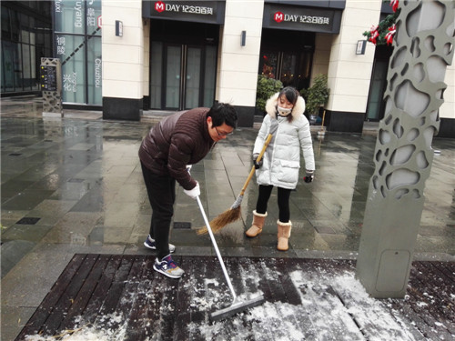 23日的凌晨整個湖州城積雪加上冰凍,仿佛進(jìn)入了“慢鏡頭”模式,緩緩地開車,小心翼翼地行走。愛山廣場步行街區(qū)也被這白茫茫的一片籠罩著,雖然只是薄薄的一層,可耐不住冰凍呀!看到這樣的情況,物業(yè)服務(wù)中心的領(lǐng)導(dǎo)和員工們第一時間行動起來打響了道路暢通“保衛(wèi)戰(zhàn)”。在潘文哲、邢燕的帶領(lǐng)指揮下我們分成了3個組,把愛山廣場步行街內(nèi)主干道路段:人民路、紅線范圍內(nèi)公園路,志成路(北起20#車庫口南至紅旗路口),同岑路(東起人民路口西至星火7#樓北側(cè))進(jìn)行包干。一大早,大伙兒就在各自的“包干區(qū)”里忙活起來。除雪、鏟冰、使用高壓水槍沖刷地面是個體力活,所以盡管室外白雪皚皚、寒風(fēng)刺骨,可是不少員工們的額頭上還是冒出了汗珠,直到早上十點鐘多,終于把三條主干道的積雪及薄冰鏟除干凈,大伙懸著的心放下了。